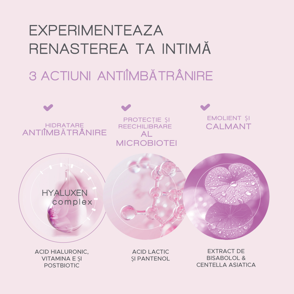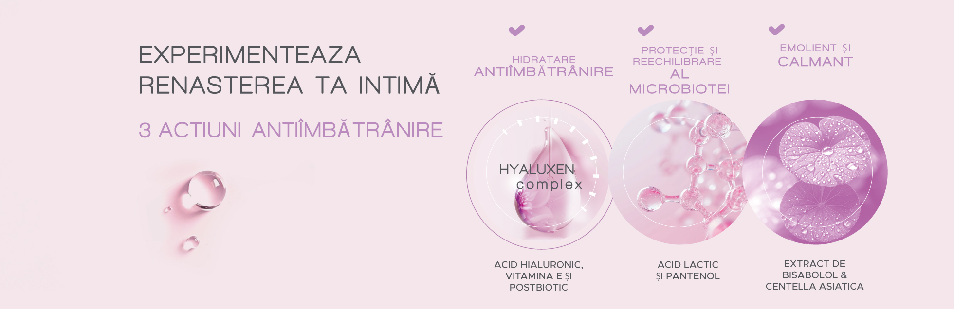 - Complex Hyaluxen : cu acid hialuronic, vitamina E și postbiotic, pentru o acțiune intensă de hidratare , anti-îmbătrânire și elasticizare , pentru confort intim zilnic.